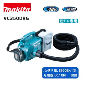 マキタ 18V 充電式小型集じん機 VC350DRG バッテリBL1860B×1・充電器付 ホース(φ28mm×2.5m) フロントカフス22・ダストバッグ ノズル付 商品説明 粉じん専用 ◆吸込仕事率(W) : 強 50 / 弱 1...