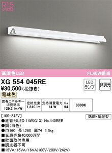 【特長】●肌もくらしも色鮮やかに。日常を彩る高演色LEDです。【仕様】●メーカー:オーデリック●型番:XG554045RE●商品名:●防雨・防湿型●壁面取付専用●R15 クラス2●高演色LED●1灯用●FL40W相当●LEDランプ型●...