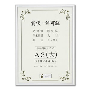 使いやすいシンプルなデザインの賞状額。 ・タテ向き・ヨコ向きどちらでも使用可能。 ・つり紐付。 ■サイズ(縦×横×幅):本体サイズ:457・336 適正用紙サイズ:439・318 ■仕様:大A3サイズ ■材質:枠:ア