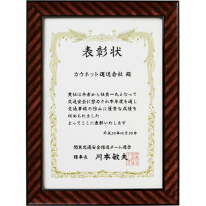 額縁の種類【高級賞状額】1450M A3。適用作品サイズ437X316ミリ。額縁外サイズ509X388ミリ。額縁のタイプ木製ダークブラウン/1.8ミリアクリルガラス付。