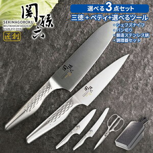 日本製 ステンレス 一体型 左右兼用 両刃 関孫六の人気シリーズ「匠創」の包丁セット人気のステンレス一体型包丁「匠創」の三徳包丁・果物ナイフ2本と、包丁研ぎ器の3点セット。包丁研ぎ器は関孫六ブランドの高級シャープナー。良い包丁を最高の...