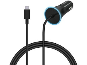 Qualcomm (R) Quick Charge (TM) 3.0対応で激速充電。 USB Type-CケーブルとUSBポートを搭載し、合計最大出力30Wでスマートフォンなど2台を同時に車で充電できる車載充電器。