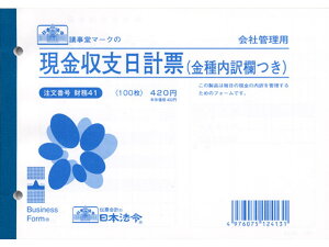【仕様】●現金収支日計票(金種内訳欄つき)●サイズ:B6●入数:100枚【検索用キーワード】法令様式 財務41 にほんほうれい ニホンホウレイ B6バラ売り 1冊売りザイム41 ノート・紙製品 法令様式 ビジネスフォーム 総務、庶務