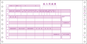 サイズ:254×127mm ミシン目切り離し後のサイズ:241×127mm 複写枚数:3 項目名:1,給与明細書;2,給与明細書;3,給与明細書 入数:250セット