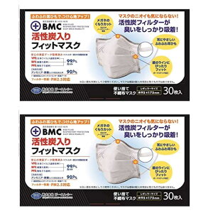 サイズ:ふつうサイズ (60枚)◆商品名:BMC 活性炭入りフィットマスク 30枚 2個セット説明活性炭フィルターがニオイをしっかり吸着。マスクのニオイも気にならない。 耳にやさしい、ふわふわ耳ひも (5mm)...