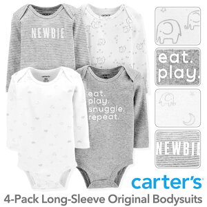【商品説明】 楽天人気ランキング「ベビー用肌着総合部門」1位獲得!お休みからお出かけまで毎日使えるから、何着あっても嬉しいカーターズ4枚組長袖ボディースーツです。 Tシャツのようなしっかりとした生地を使用していますので、吸