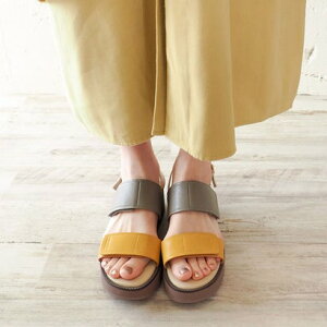 大胆なカラーコンビが目を引くモダンなサンダル。コーディネートのアクセントになる一足です。2本のベルトはそれぞれ面ファスナーで自身の足にあわせた調節が可能。全体に厚みのあるプラットフォームデザインで履きやすさも◎こちらは