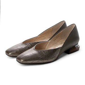 前後の切り替えデザインでシンプルながらも表情のあるローヒールパンプス。ウッドプリント×メッキのコントラストがモダンなデザインヒールもポイントです。スクエアトゥですっきり見えする大人な一足。前後の素材を統一したブラック