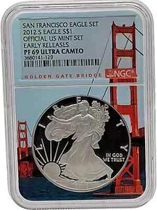 PROOF SILVER EAGLE NGC PF69 ULTRA CAMEO GOLDEN GATE BRIDGE LABEL RED CORE