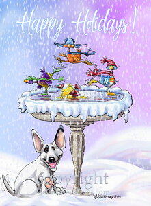 ブル・テリア クリスマスカード。 優しい色合いで描かれた可愛いカード。 愛犬家の方へのプレゼントに添えていただくのに最適です。 額などに入れていただくと、素敵なインテリアとしてお楽しみいただけます。 サイズ 約11.7センチ×1