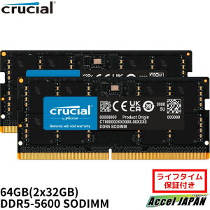 crucial 32GB Kit(2x16GB)DDR5-5600 SODIMM CL46(16Gbit) CT2K16G56C46S5テクノロジー:DDR5速度:5,600MT/秒容量:32GB(1...
