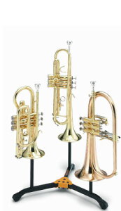 トランペット/コルネット/フリューゲルホーンスタンド 収納バッグ付トランペット/コルネット用ペグを2つ、フリューゲルホーン用ペグを1つマウントしたスタンドです。SFF(スペシャルフォーミュレイテッドフォーム)ゴムで、ソフトにピッ