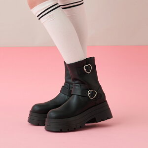 ■ジュニア ■ハート型のバックルがかわいいエンジニアブーツです。軽やかな厚底の設計とやわらかい合皮素材で、快適なはき心地を実現しました。サイドにファスナーがついており、着脱しやすいのも魅力。さまざまなボトムスと相性が良