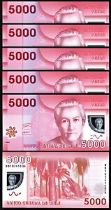 Chile 5000 Pesos 2021 (2022), UNC, 5 Pcs LOT, POLYMER, P-163h, New Sign, Prfx BB
