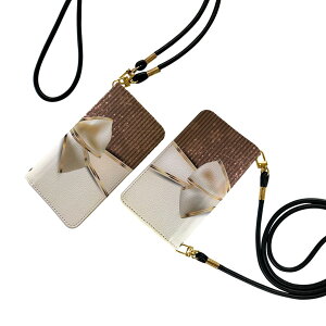 商品特徴・ショルダー付き手帳型スマホケース・シームレスな全面デザイン(内側は落ち着いたオフホワイト)・外側は高品質の人工革を使用・内側にはスマホを装着するケースが付属・機種専用のカメラホール仕様でケースを装着したまま