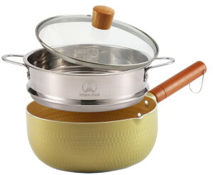 18cm ガス火・IH対応 強化ガラス蓋付 こびりつきにくい 内面フッ素加工 蒸し器付き 蒸し料理 両側注ぎ口 片手鍋 お手入れ簡単 (ゴールド, 18cm) 雪平鍋 18cm ガス火・IH対応 強化ガラス蓋付...