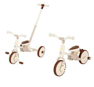 部品を組み替えて、三輪車からトレーニングバイクに変身! 工具不要の簡単組立。 ●三輪車 かじきり押棒付きで、高さは4段階に調節可能。フリーペダル機能搭載でペダルに足が届かない時は、ペダルをサドル下に取り付け足置きステップと