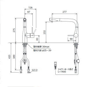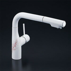 シングルシャワー付混合栓。吐水口回転規制160°。逆止弁付。水受けトレー付。eレバー水栓。マットホワイト。桜柄。接続ねじ系:G1/2。取付穴径:Φ35〜39。取付板厚:30MAX。吐水口長さ:277mm。一般地仕様。シャワー引出し式。...