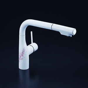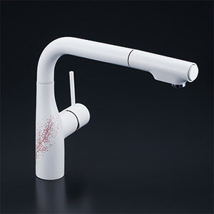 吐水口回転規制160° 水受けトレー付 色:マットホワイト、柄:サクラ eレバー水栓、NSFシャワー 省施工仕様、逆止弁付