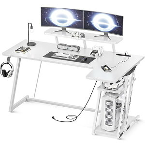【送料無料】ゲーミングデスク L字 パソコンデスク コンセント付き l字デスク 幅140*奥行80/55 pcデスク デスク 机 ラック付き ゲーミングテーブル 収納 オフィスデスク 在宅勤務 組立簡単 ホワイト ...