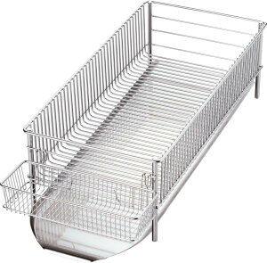溶接部分が少なく汚れがたまりにくいステンレス製の水切りかごです。 トレーが斜めに傾いているので、洗い物の水がトレーにたまらずシンクに流れるので便利です。 付属のポケットでカトラリーや調理小物もしっかり水切りできます。 <