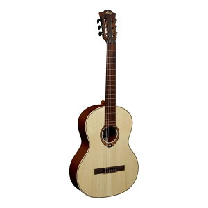 フランスのギターメーカー LAG Guitarのガットギターです。 スプルース単板トップにサペリサイド・バック。 LAGならではのウッディなサウンドホールデザイン。ボディエッジををなめらかに加工したつ...