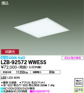 光源 ◆LED(温白色) ◆色温度:3500 K ◆光源寿命40000時間(光束維持率85%) 寸法・質量 ◆埋込穴角:□600 mm ◆埋込高:90 mm ◆質量:3.8 kg 仕様・注意事項 ◆器具光束:8840...