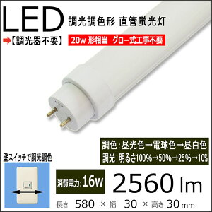新型 LED蛍光灯20W形直管-16W スイッチで調光調色機能付き グロー式工事不要 ●型号:20w形 ●調色:昼光色→電球色→昼白色 調光:明るさ100%→50%→25%→10%●口金:G13 ●全光束:2560lm ●電源:電源内...