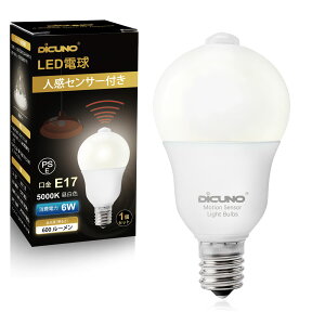 サイズ:1個入◆商品名:DiCUNO LED電球 E17口金 人感センサー 6W 60形相当 600lm 昼白色 5000K 明暗センサー付き 消し忘れ防止 赤外線センサー 自動点灯 高輝度 AC100V...