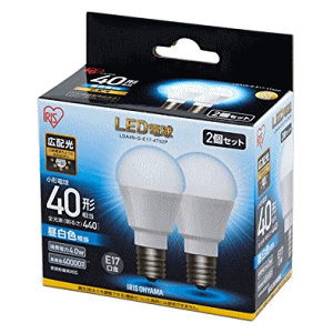 白熱電球のように広範囲に明るい広配光タイプなので、トイレや階段などの照明に最適です。口金サイズがE17口金なので、照明器具を替えることなくご使用いただけます。 製品に関するお問合せアイリスコール:0120-211-299【受付時間】平...