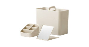 サイズ/約幅21×奥行11×高さ23cm 重量/595g(ミラー含む) 内容量/1個 材質/ボックス・ハンドル・トレー・スタンド・ミラー(フレーム):スチロール樹脂 ミラー:高透度ガラス 種類/ホワイト、グレー、ベージュ<br