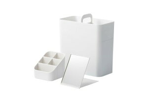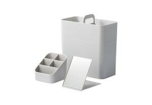 サイズ/約幅21×奥行11×高さ23cm 重量/595g(ミラー含む) 内容量/1個 材質/ボックス・ハンドル・トレー・スタンド・ミラー(フレーム):スチロール樹脂 ミラー:高透度ガラス 種類/ホワイト、グレー、ベージュ<br