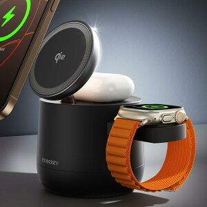 MagSafe対応iPhoneシリーズ、ワイヤレス充電対応のAirPodsシリーズ、さらにApple Watch磁気充電ケーブルをはめ込むことでApple Watchシリーズも3台同時にワイヤレス充電できる充電器です。 iPhone...
