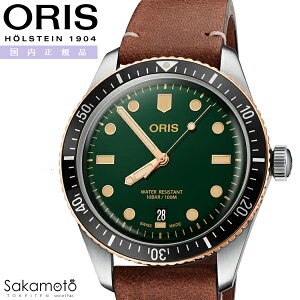 mm)、ねじ込み式ケースバック、シルバーの分目盛りのブラック一方向回転ベゼル。 12時の位置に「Oris Automatic」のグリーンの文字盤、ベージュの発光コーティングが施されたシルバートーンの針...