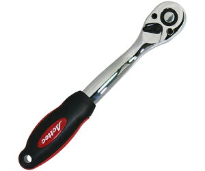 指が当たりにくいオフセット型プロ用ラチェットハンドル。 滑らかな送りギヤ数72山。 正逆転切替。 滑りにくいエラストマー樹脂ハンドル。 差込角:9.5mm。