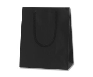 縦長サイズのツヤあり手提げ紙袋(黒)。表面にPP貼りを施し高級感があり、ギフト用に最適です。・ツヤ有りで高級感・ギフト用に最適・持ち帰り用の袋に