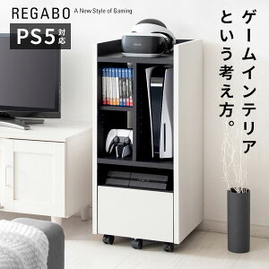 ソフトや周辺機器をまとめて収納できる便利なデザイナーズゲームラック『REGABO(レガボ)』。 ヘッドフォンやSwitchなど携帯ゲーム機が置ける天板、PS5など据置型ゲーム機が縦にピッタリ収まる可動棚付きオープ