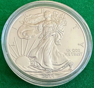 2014 American Silver Eagle 1 Oz .999 Fine Silver UNC In capsule。組成:銀。形状:ラウンド。発行年:2014年。純度:0.999。1オンスあたりの貴金属含有量。