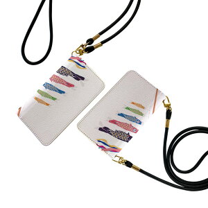 ショルダー付き手帳型スマホケース・シームレスな全面デザイン(内側は落ち着いたオフホワイト)・外側は高品質の人工革を使用・内側にはスマホを装着するケースが付属・機種専用のカメラホール仕様でケースを装着したまま