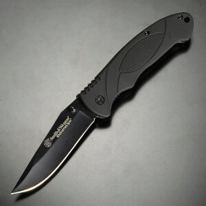 折りたたみナイフ 黒刃スミス&ウェッソン社製、黒一色の折りたたみナイフ。米国老舗銃器メーカー「Smith&Wesson」が手掛ける折りたたみ式ナイフ。ブレードは黒色のハイカーボンステンレス鋼で作られており、根元に両