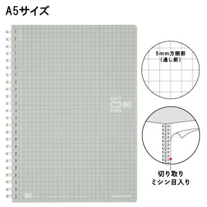 ●サイズ/A5(3号) ●5mm方眼罫 ●80枚 ●切り取りミシン目入り ●中紙/上質紙(ECFパルプ) ●表紙/表:透明PP、裏:板紙 ●リング/オレフィン系樹脂 ●柔らかリングでリングを気にせずに書ける ●平に開く ●狭い場所で