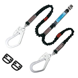 仕様:フルハーネス用ツインランヤードのみ(ノビロン/スイベル式アルミフック) ロープ色:ブラック、ランヤードサイズ:幅32mm×長さ[収縮時]1,150~1,250mm/[伸長時]1,600mm 構造物側フック:FS-93SV(軽量・...