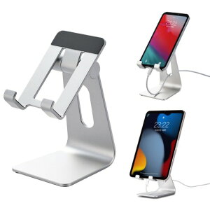 iPhone・スマートフォンを設置できる、アルミ製のスタンド。無段階での角調整が可能で、13mm以内であればケースを付けたたまにも対応。4インチ/5インチ/6インチ/Nintendo Switchなどに対応。シルバーのスタイリッシュな...