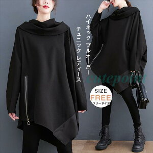 チュニック レディース ハイネック プルオーバー 秋 冬 長袖 トップス アシンメトリー カットソー Tシャツ タートルネック チュニックワンピース 無地 ゆったり 体型カバー カジュアル ナチュラル...