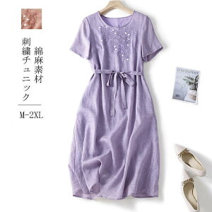 チュニック ワンピース レディース tシャツ シャツ 半袖 レディース ロングワンピース 夏 刺繍 綿麻 40代 体型カバー ゆったり 薄手 涼しい お洒落 リネン コットン 30代 50代 ★素材:綿麻...