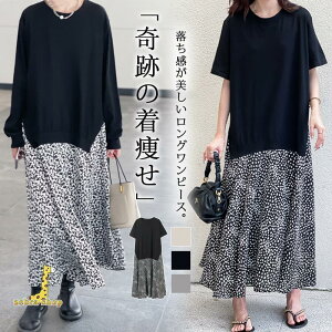 Tシャツワンピ マキシスカート 2点セット レディース 重ね着 ワンピース ロングTシャツ チュニック 色切り替え ロングワンピ 長袖 ドレス 春 秋 ロングスカート Aラインスカート レトロ セット...