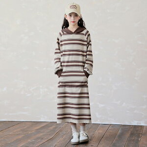 ロングストレート フード付き スカート サイドスリット ストライプTシャツワンピース スリム見え 女の子 子供制服 おしゃれ 可愛い レディース カジュアルファッション 130 140 150 160 165cm...