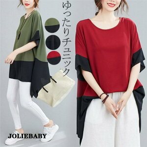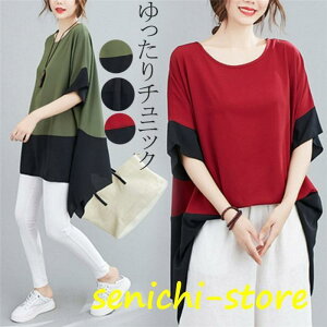 チュニック レディース 大きいサイズ tシャツ ワンピース チュニックワンピース Uネック 半そで ブラウス 夏 プルオーバー ロング丈 トップス シャツ tシャツ 切替 半袖 ゆったり カジュアル 部屋着...