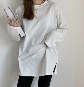 レディース ロンTが登場!このロンTは、丈長デザインとノーカラーのラウンドネックが特徴で、シンプルながらもこなれ感のあるスタイルを実現します。ストレートなシルエットが体型を美しく見せ、カジュアルながらマニッシュな雰囲気も
