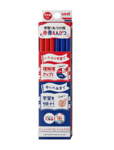【商品特長】 ・転がりにくく、正しい持ち方が学びやすい六角軸 従来の朱藍鉛筆、朱通し、藍通しでは丸軸が主でしたが、学童向けの製品であることを意識して正しい持ち方の練習がしやすく、軸が机上で転がりにくい六角軸にしています